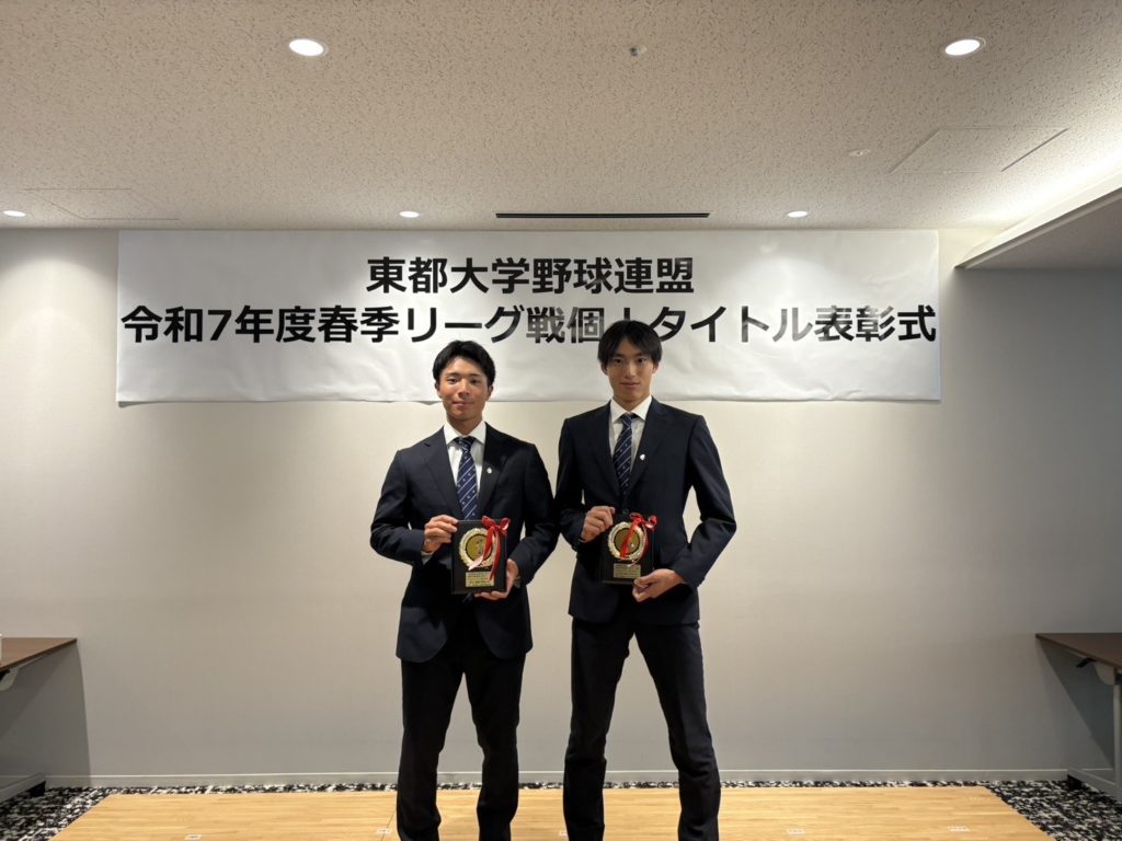 【令和7年度3部春季リーグ戦個人タイトル表彰式】 お知らせ 2025.06.292025.11.24 本日、中央大学後楽園キャンパスにて、個人タイトル表彰式が行われました。本院からは2名の選手が受賞しました。写真左から肥沼徹(都立小山台)、比江島幹人(日本大学鶴ヶ丘)
